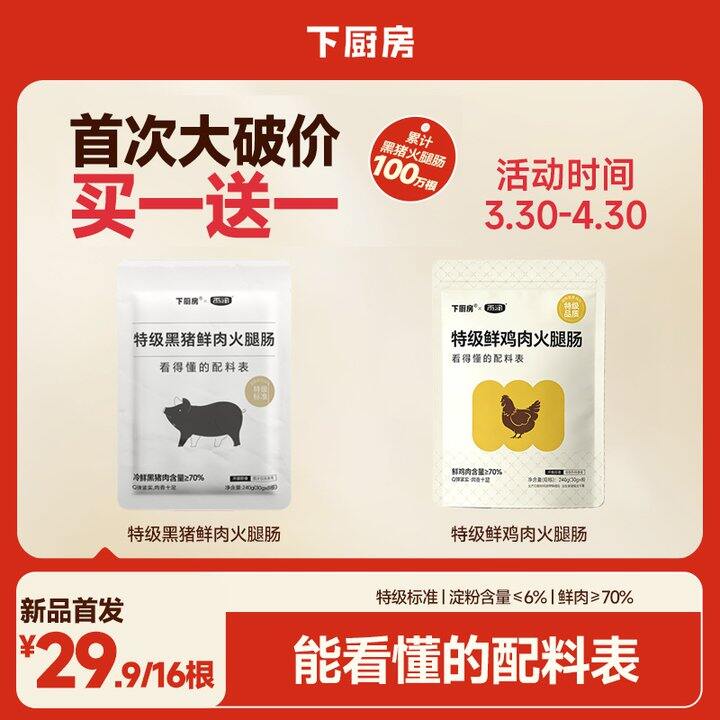 第二款是【下厨房|特级鲜肉火腿肠】现在活动买一袋送一袋特级鲜鸡肉火腿肠(小贩试吃反馈:肉感扎实,很香,比较偏少淀粉的午餐肉口感)~喜欢吃火腿肠的一定要试试