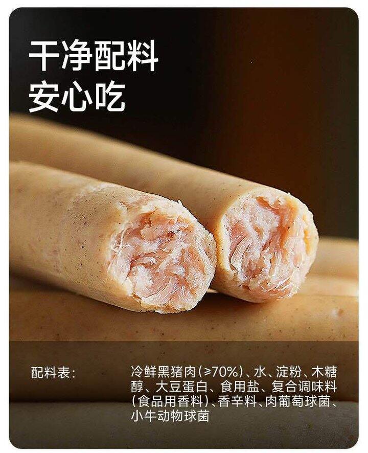 特级黑猪鲜肉火腿肠,冷鲜黑猪肉(≥70%)、水、淀粉、木糖醇、大豆蛋白、食用盐、复合调味料(食品用香料)、香辛料、肉葡萄球菌、小牛动物球菌~