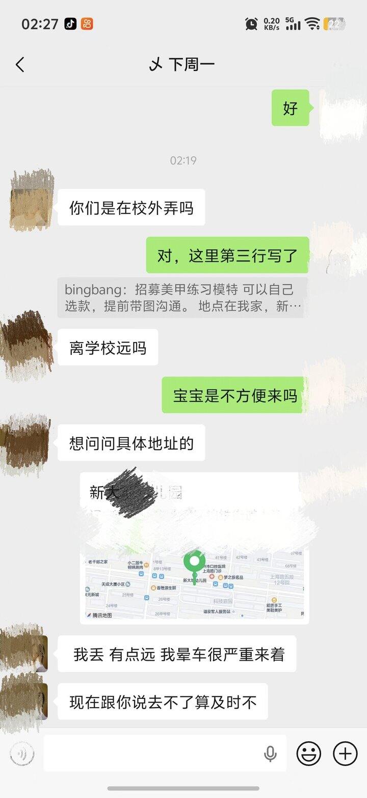 (因为我之前就遇到过以前找我拍照的一个人,他没有跟我成交,然后看我最近朋友圈发的美甲做的挺好的,他就来问我还需不需要做美甲,说到底我心里其实是有一点小介意的,以前你没选择我,现在有便宜占你来了。但我又想,正好有一天空着,如果他能那天来的话,那也可以,我正好有人练习,然后我们前边聊完了以后到最后一步,我给他发地址坐标定位,他说有点远,不来了。我一下就很生气,因为地址文字版,详细的这个说明我都是在朋友圈发过的,他想来免费做美甲,却连我朋友圈发的说明都没认真的看一看。