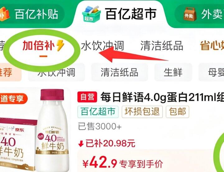 点这里 享大额bu贴-加倍补-下拉找到牛奶加购(如图2)
