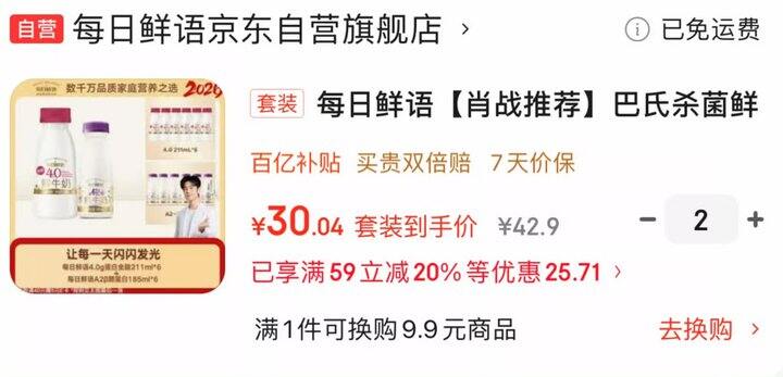 返回🛒,牛奶拍2件+凑1件,每日鲜语到手60