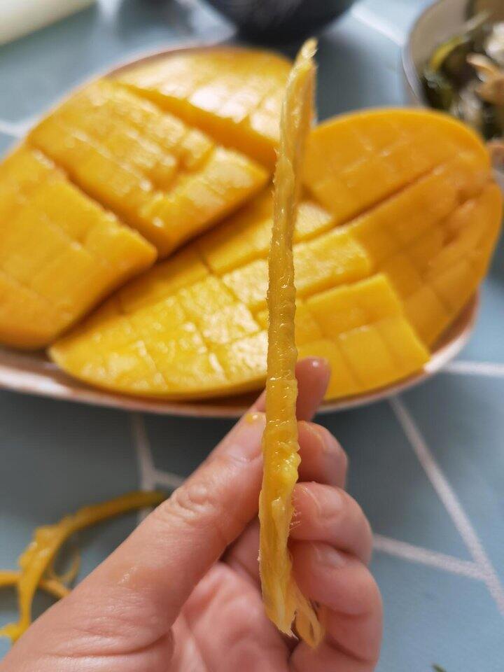 √隔着果皮就可以闻浓郁的香气, 金煌芒果皮薄肉厚、果肉Q弹,无筋无丝。饱满的身材,口口都是肉,享受一口咬下满嘴厚实芒果肉的幸福~