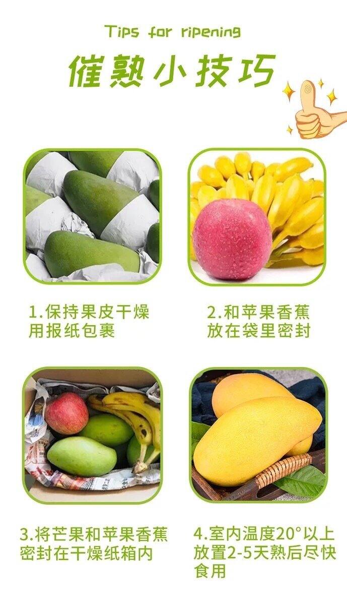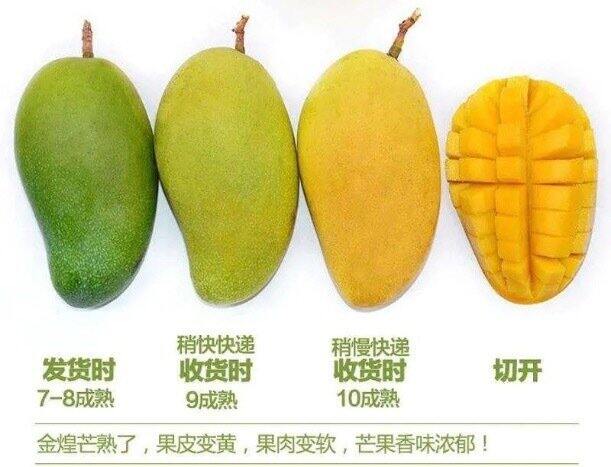 收到的芒果放在常温阴凉处即可,不可放入冰箱。成熟的芒果可在冰箱保鲜存放3-5天,货为7-8成熟,收到后,先用手轻摁判断一下,有软的,可以先吃。正常是需要常温放2-4天,芒果达到了9分熟,即可食用~