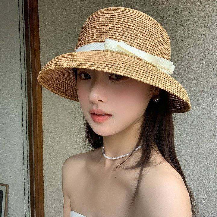 赫本风蝴蝶结蝴蝶结草帽女春夏季出游透气草编渔夫帽遮阳防晒帽子