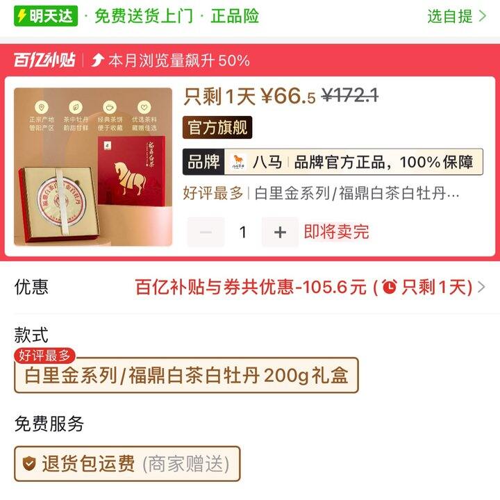 【八马】茶业 福鼎白茶白牡丹茶饼礼盒 礼袋200g