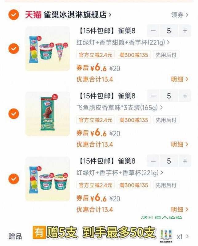 拍15件99,折1.9/支💰有赠5支,到手最多50支雀巢 多口味冰淇淋雪糕任选https://m.tb.cn/h.irGEIuu
