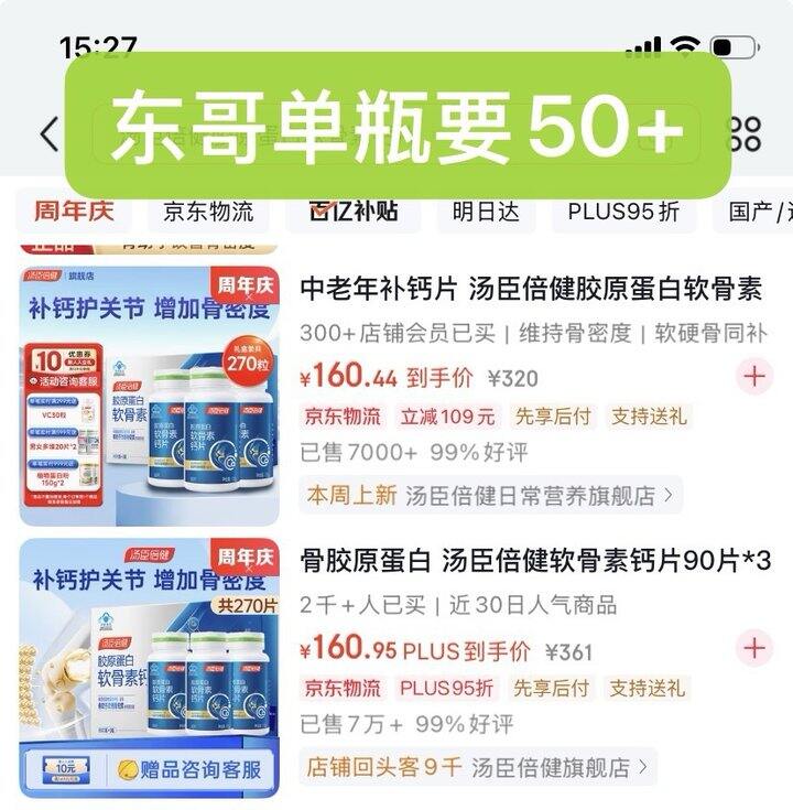 小跑去随时不抵扣!!!东哥一瓶多的忦我们买两瓶 补钙护关节,增加骨密度✅ 可重复拍个2單 还是礼盒