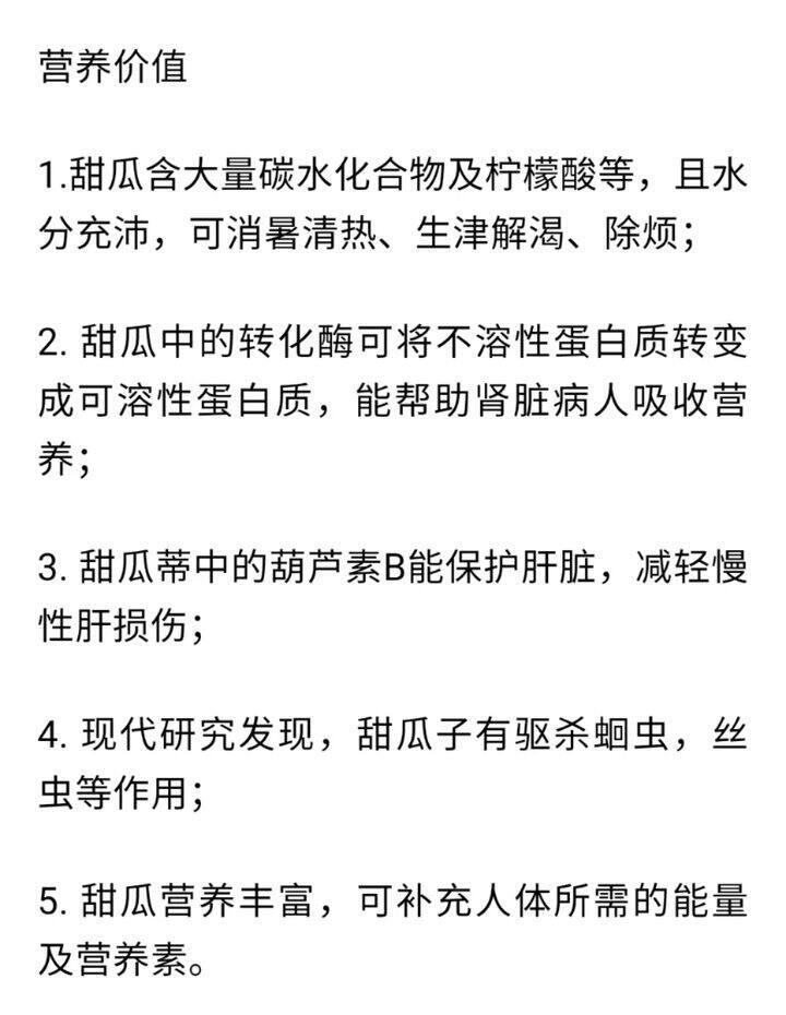 事实上其营养价值可与西瓜媲美芳香物质、矿物质、糖分和维生素C的含量则明显高于西瓜 👍多食甜瓜有利于人体心脏和肝脏以及肠道系统的活动✨促进内分泌和造血机能祖国医学确认甜瓜具有~