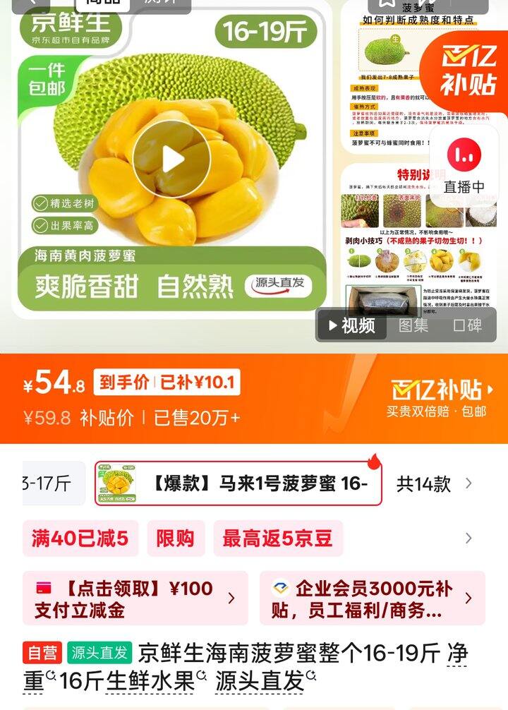 京鲜生 海南菠萝蜜整个16-19斤净重16斤