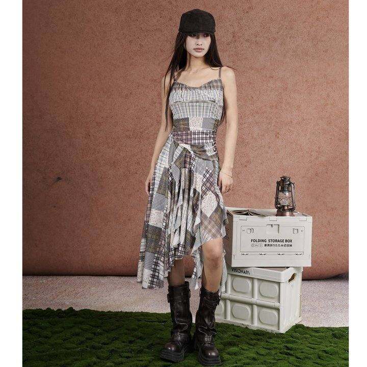 西町村屋格纹拼接层次连衣裙女夏季新款复古长款吊带裙XAAB10086