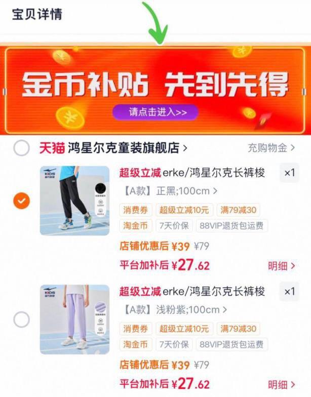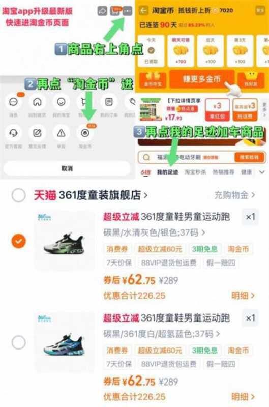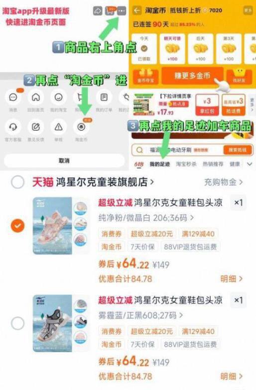弹18.8礼金,点击右上角“...”进入淘金币页面抵扣6.98,实付68.22元