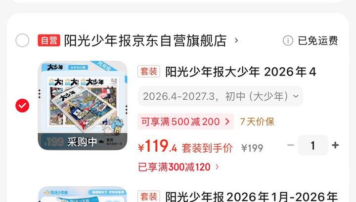 2️⃣ 1,阳光少年报大少年 2026年4月-2027年3月订阅 初中版 赠少年知天下音频卡