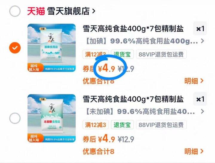 1️⃣淘宝搜省钱卡,一键领取2️⃣雪天精制盐400g✘7包