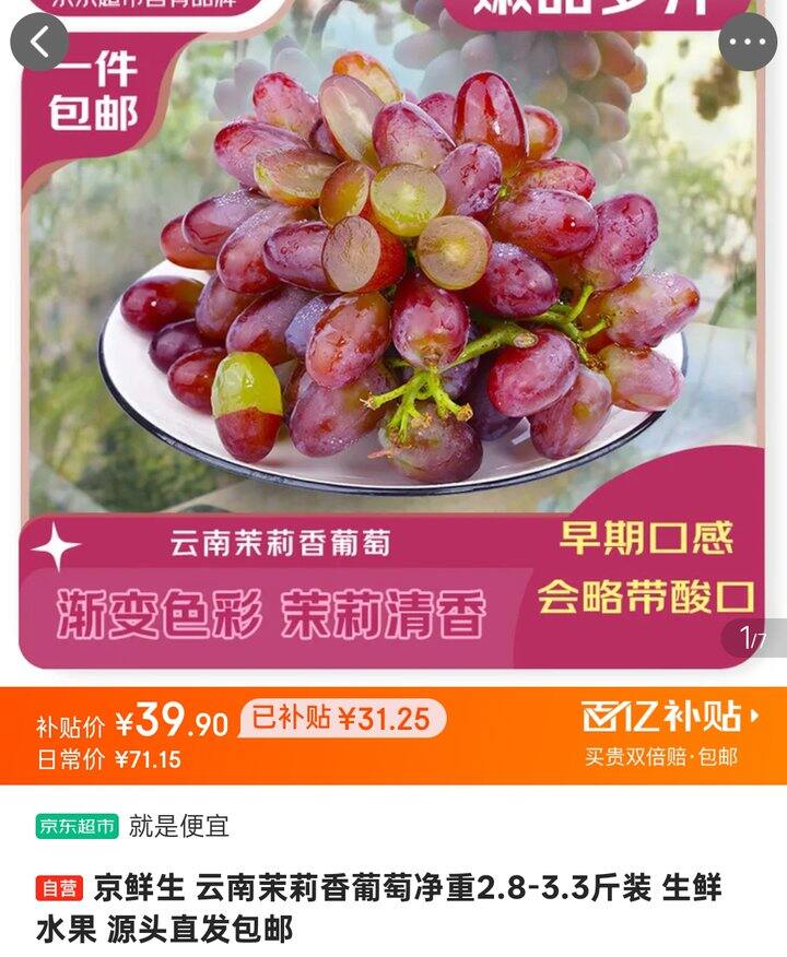 【自营】京鲜生 云南茉莉香葡萄