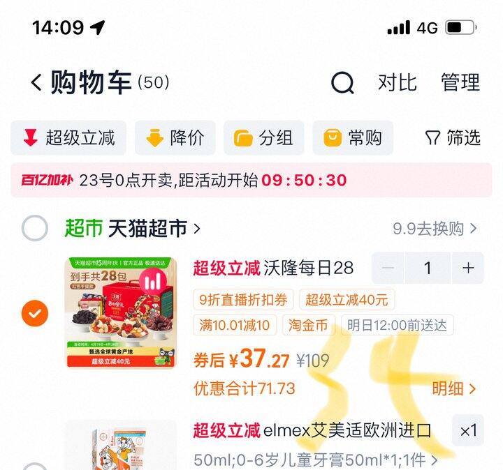 右上角直播间弹9折券,加购。购物袋上方圈权益领39-5