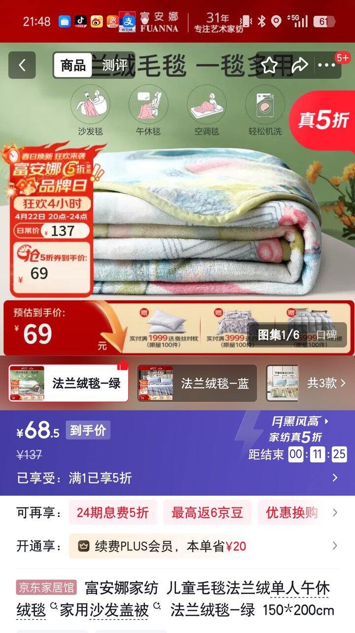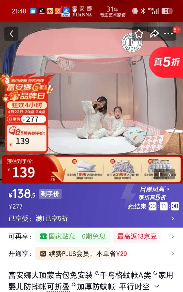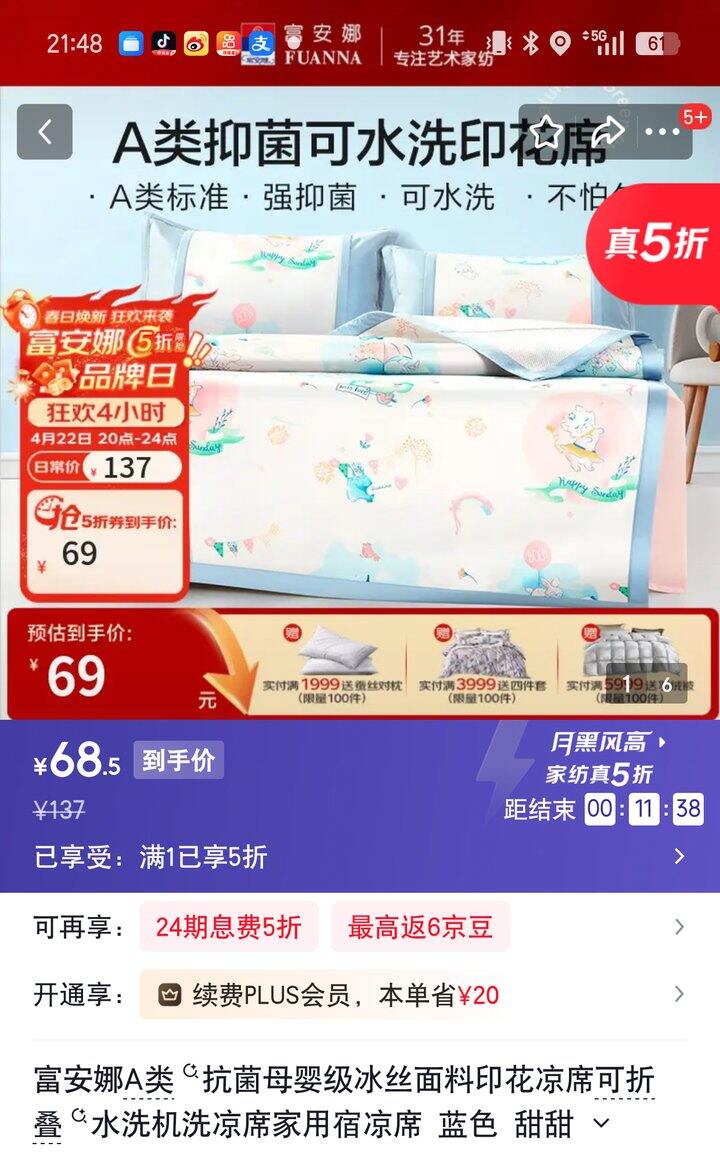 【奶茶东】富安娜家纺5折