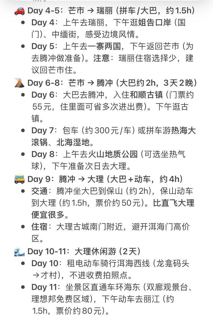 路线逻辑:成都 → 芒市(飞)→ 腾冲 → 瑞丽 → 大理(大巴+动车)→ 丽江 → 香格里拉 → 昆明 → 漳州(动车)。