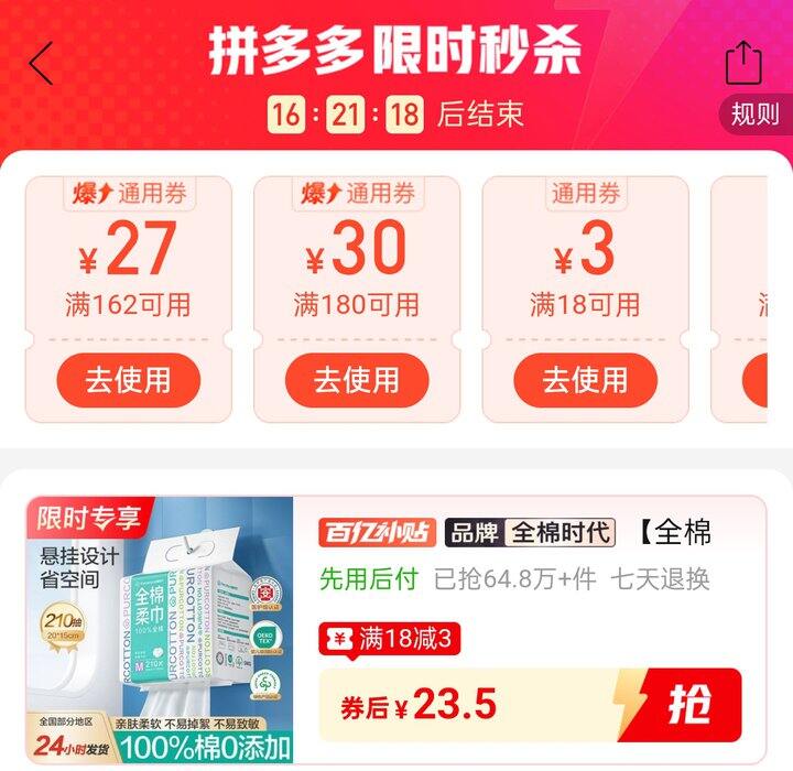⭕️23.5🉐全棉时代悬挂式M码210抽+10抽,45🉐2提