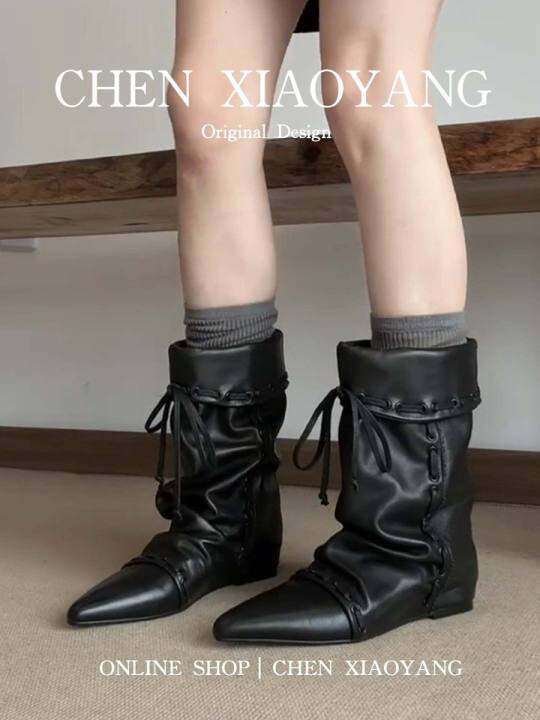 真皮小众设计感褶皱堆堆靴女废土风平底西部牛仔靴百搭韩版骑士靴