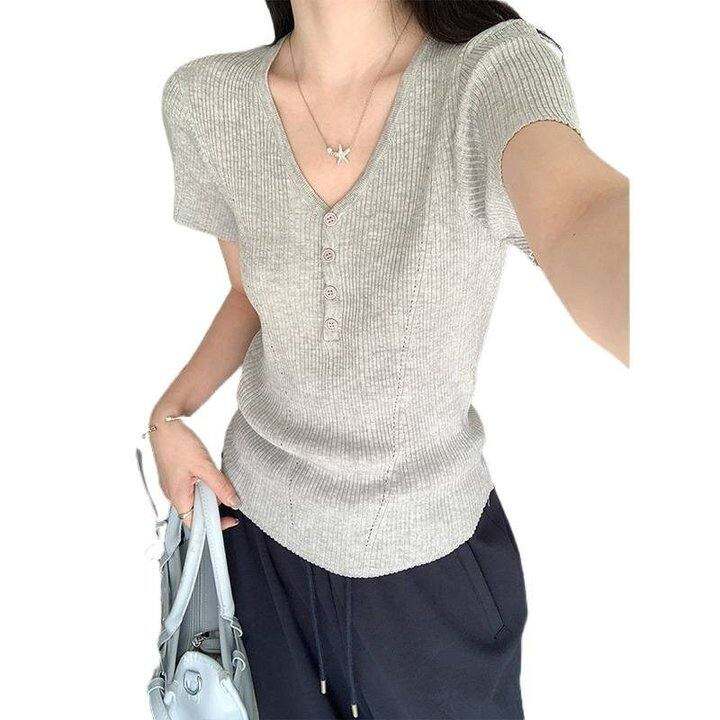 莱赛尔高级感V领贝壳短袖 夏季新款 修身收腰显瘦短袖气质上衣