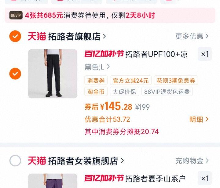 1、拓路者【裸感裤】UPF100+轻薄透气快干裤夏季接触凉感弹力休闲裤https://m.tb.cn/h.it1tTJL,弹35礼金,淘金币页面加购,入会