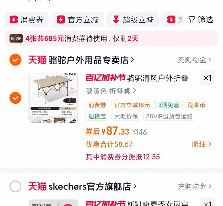 1、骆驼清风户外折叠桌折叠椅子露营装备蛋卷桌户外野餐便携https://m.tb.cn/h.itSwL0o,弹21.6礼金,淘金币页面加购