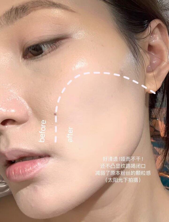 肉眼看到就是那种透亮奶油肌的感觉~显得皮肤好好!!粉质真的巨巨巨细腻!上脸轻轻一拍就能均匀毛孔瞬间隐形!而且特别轻薄,放包里补妆也不占位置