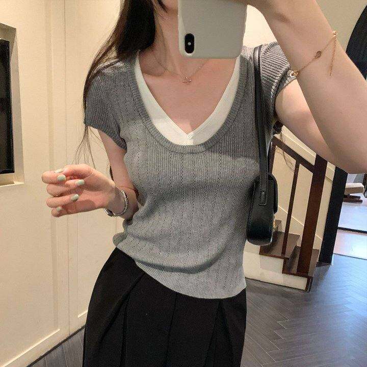 拼接假两件绝美巨好看V领黄色短袖针织衫女夏季新款漂亮独特上衣