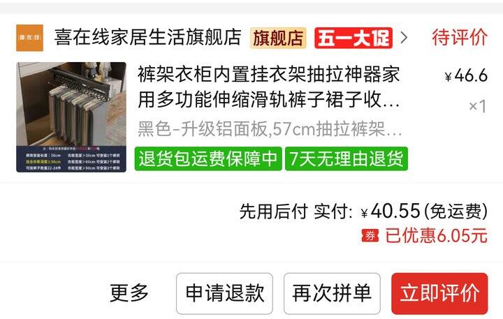 最近在收拾衣柜,因为中间衣柜都是空格,单独放衣服总是拿的乱七八糟,就买了抽拉裤架,没想到还挺好用,基本四季的牛仔裤都能放了,而且还不用扒拉,抽拉也很丝滑