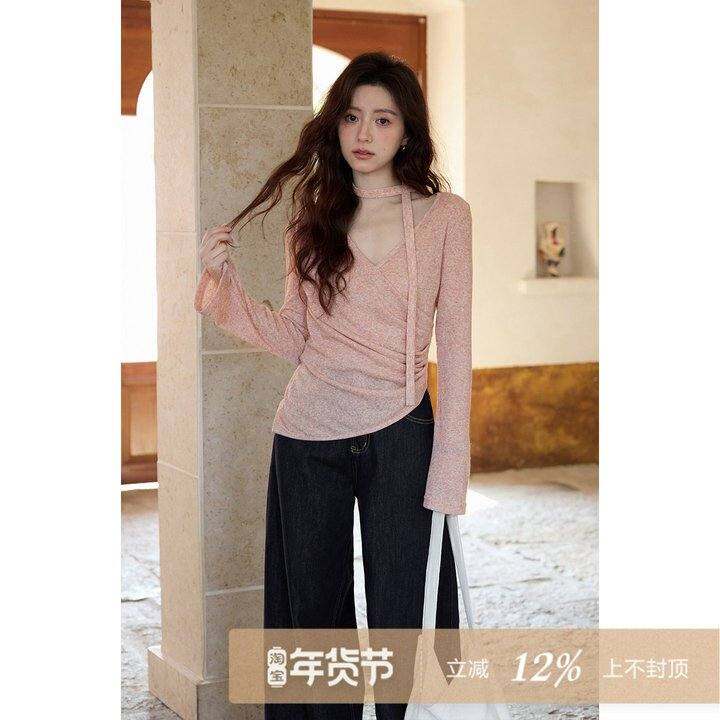 夕蒙2026新款春季韩系纯欲风气质上衣设计感掐腰V领粉色长袖T恤