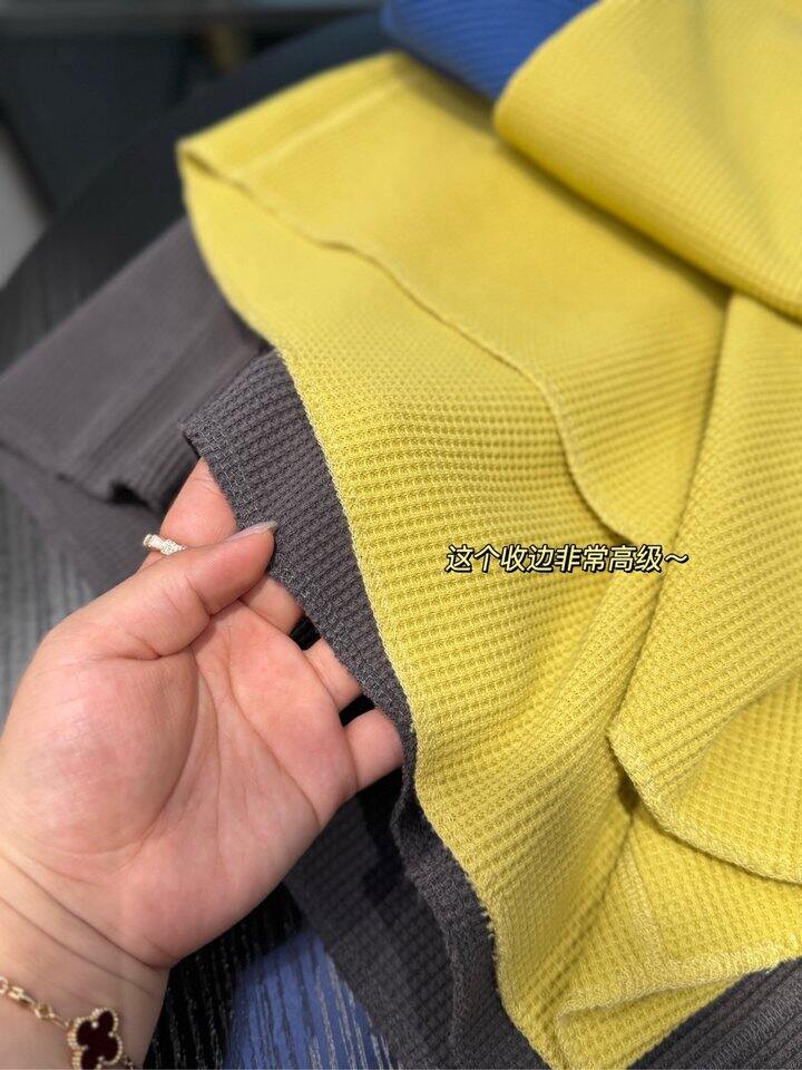 采用经典华夫格针织面料,纹理清晰有立体感,上手软糯有筋骨,透气吸汗还挺括