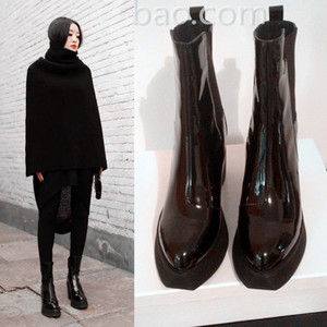 AW欧美英伦尖头粗跟短靴 真皮牛漆皮厚底高跟女靴 松糕跟马丁靴潮