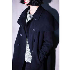 SUPERSCAPE 原创设计 黑色羊毛呢斗篷双排扣长大衣外套 14秋冬