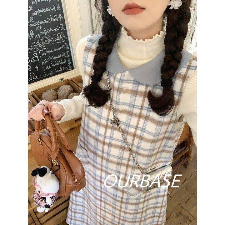 ourabse 圣诞新年季 原创蓝白格毛呢娃娃领连衣裙显瘦格纹背心裙