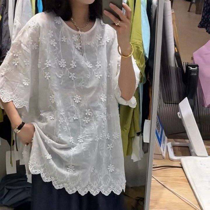 夏新款时尚圆领立体花朵波浪边T恤宽松休闲衬衫百搭小众气质上衣
