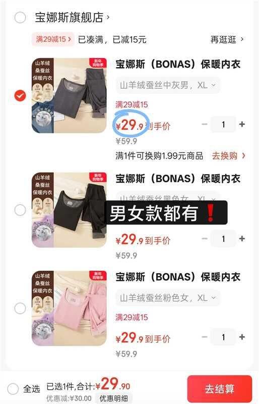 宝娜斯 男女秋衣套装